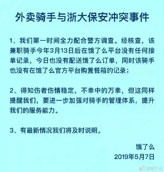 针对外卖骑手与浙大保安冲突事件,饿了么官方回应称,该骑手为“兼职”,今年3月13日后在饿了么平台没有任何接单记录。饿了么称,经核查,该兼职骑手今年3月13日后在饿了么平台没有任何接单记录,今日也没有配送饿了么订单,同时该骑手也没有在饿了么官方平台购置餐箱的记录。