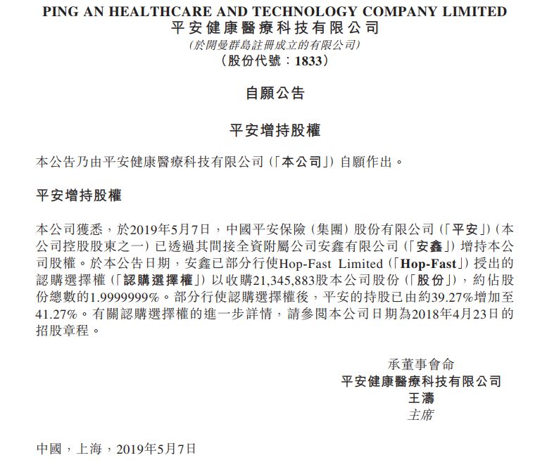 13.平安好医生:平安保险部分行使认购权后,持公司股份增至41%