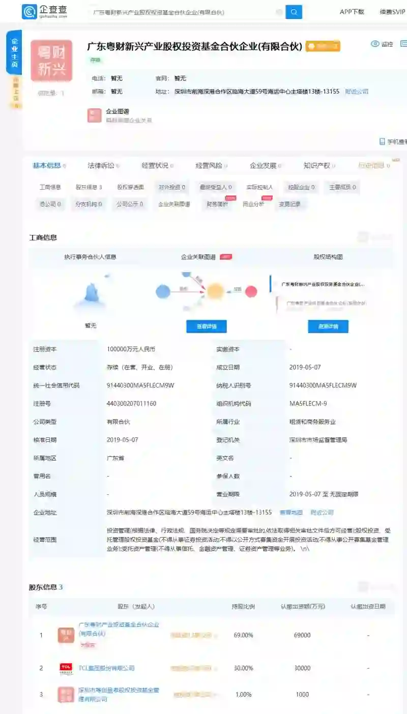 企查查数据显示,5月7日,TCL集团股份有限公司新增对外投资,成立广东粤财新兴产业股权投资基金合伙企业(有限合伙),该公司注册资本100000万元人民币,TCL集团持股30%,大股东为广东粤财产业投资基金合伙企业,持股比例为69%。经营范围涉及投资管理、股权投资、受托管理股权投资基金和受托资产管理。