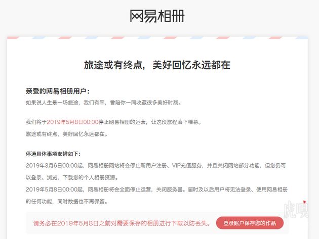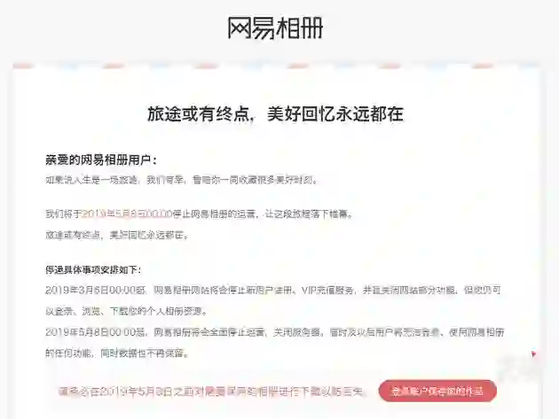 网易相册宣布,将于5月8日0点停止运营,并关闭服务器,届时数据及功能不再保留,6日0点起,网易相册网站将会停止新用户注册、VIP充值服务等部分功能。