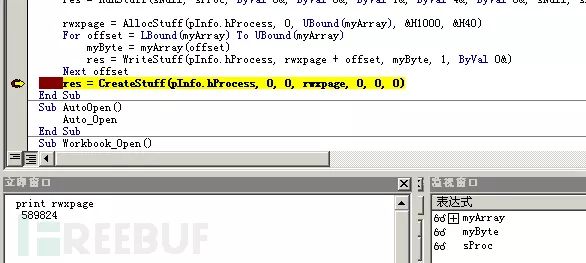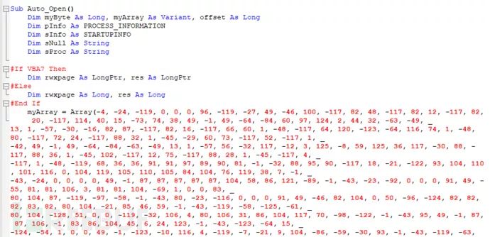 调试宏代码,该样本的宏代码没有经过混淆,可以清晰的看到其将shellcode硬编码赋值给一个数组,这里的数据长这样: