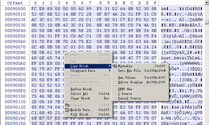 思路二:在WinHex中找到这段shellcode后,将其选中,右键->Edit->Copy Block->C Source,这样就能将数据拷贝成C++能够识别的形式: