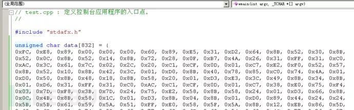 然后用Visual studio新建一个C++控制台应用项目,定义一个数组,内容为我们拷贝的C Source数据: