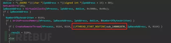 如果是遇到CreateRemoteThread的情况,就比较直观,只要直接找到该函数的第四个参数lpStartAddress,就是我们要找的context值,下图是一个示例: