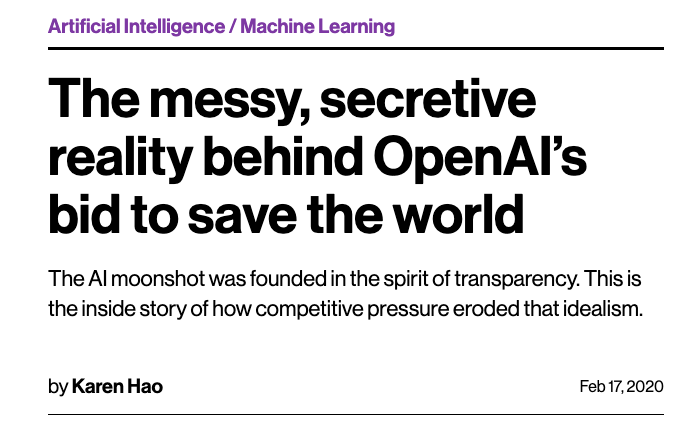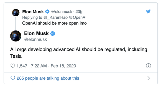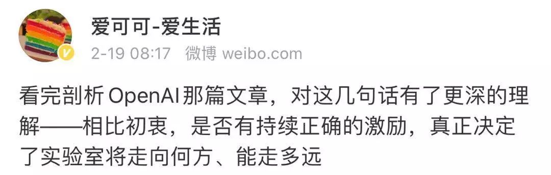资金的压力迫使OpenAI渐渐违背了其最初的保证。但不可否认的是 OpenAI 仍然是一个人才和前沿研究的堡垒,充满了真诚地为人类利益而努力工作的人们。换句话说,它的初心仍未变,仍然有时间去纠偏匡正。而另一方面,正是由于他们在尝试进入一个未知的领域,所以才会有各种各样的错误出现。作为旁观者,我们应该为他们提供正确的批评。谁会希望,在未来AGI是由像Google、亚马逊、Facebook、苹果或阿里巴巴这样的企业开发出来,而非OpenAI这样的非营利性组织呢?但放弃控制才是理想的开源的逻辑本质。倘若真的集齐足够多的最强大脑来共同完成AGI目标,打败凭借个人私力控制人工智能世界的恶念最好的方式是让每个人都拥有这项技术。针对这个问题,马斯克也非常关心,其在twitter上表示:OpenAI应该更多的开放。但是坚持初衷,完全开放对于一家只是实验室的OpenAI来说是最好的选择么?或许正如微博大V“爱可可-爱生活”引用François Chollet一段话那样吧:相比初衷,是否有持续正确的激励,真正决定了实验室将走向何方、能走多远。参考:[1] The messy, secretive reality behind OpenAI’s bid to save the world, https://www.technologyreview.com/s/615181/ai-openai-moonshot-elon-musk-sam-altman-greg-brockman-messy-secretive-reality/[2] 拿了微软 10 亿美元的 OpenAI,到底想做什么?,https://baike.baidu.com/tashuo/browse/content?id=df6178d6a398cbbcb21dc4ad&lemmaId=19758408&fromLemmaModule=pcRight