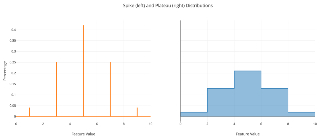 现在事情开始变得有趣了!合成数据将遵循两个自定义分布中的其中一个。第一个我称之为“ Spikes Distribution”。此分布仅允许合成特征采用少数具有每个值的特定概率的离散值。例如,如果原始分布的平均值为3且标准差为1,则尖峰(spike)可能出现在2(27%),3(46%)和4(27%)。
