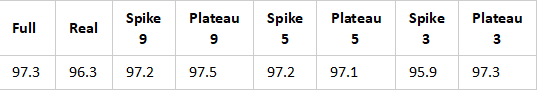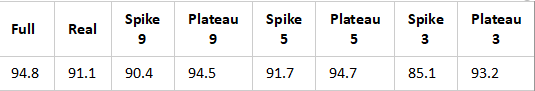 在这些表中,“Spike 9”或“Plateau 9”是指分布和使用的尖峰/平台的数量。单元格中的值是使用相应的训练/测试数据对模型进行训练/测试,并用验证集验证后的的最终精度。还要记住,“完整”(Full)类别应该是准确性的理论上限,“真实”(Rea;)类别是我们在没有合成数据的情况下可以实现的基线。