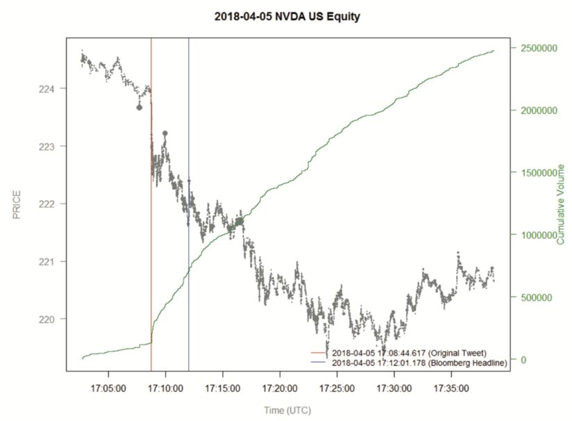 有关英伟达的推特消息发出后,股价的波动情况。市场会在短时间内作出反应。(图片来自 Bloomberg)