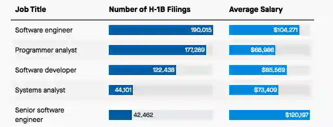 申请H-1B签证的软件工程师有大约19万人,而他们的平均工资仅略高于10万美元。