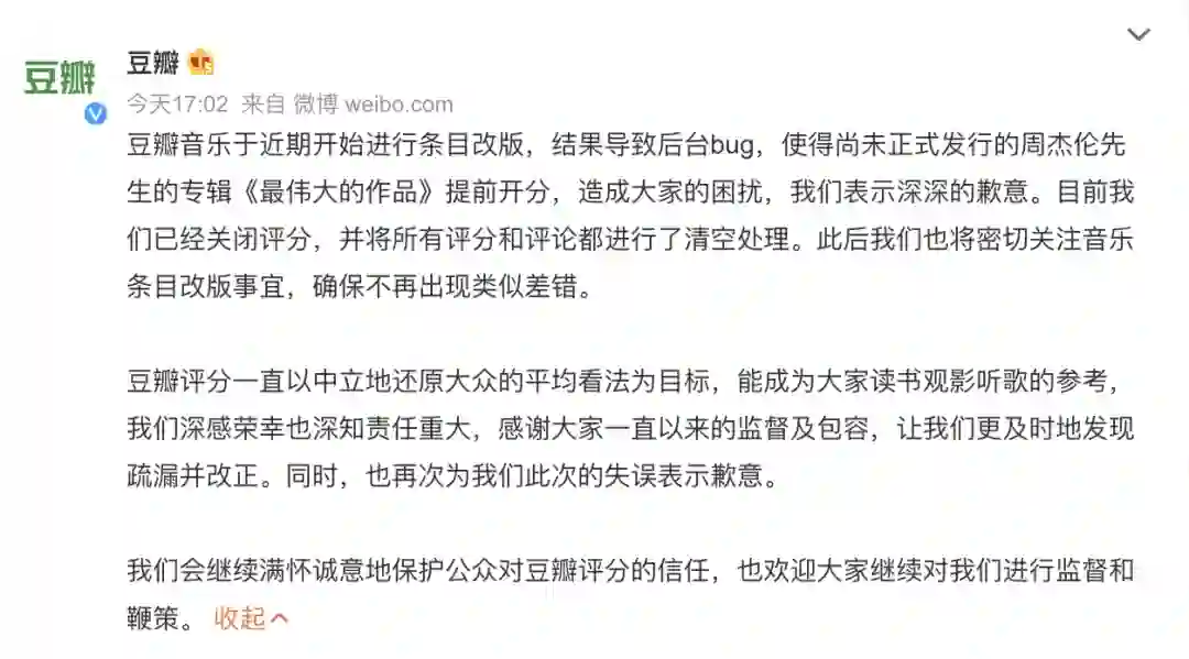 【周杰伦新专辑未发行即开分,豆瓣致歉:已关闭评分】豆瓣发文道歉,称豆瓣音乐于近期开始进行条目改版,结果导致后台bug,使得尚未正式发行的周杰伦先生的专辑《最伟大的作品》提前开分,造成大家的困扰,表示深深的歉意。目前已经关闭评分,并将所有评分和评论都进行了清空处理。(TechWeb)