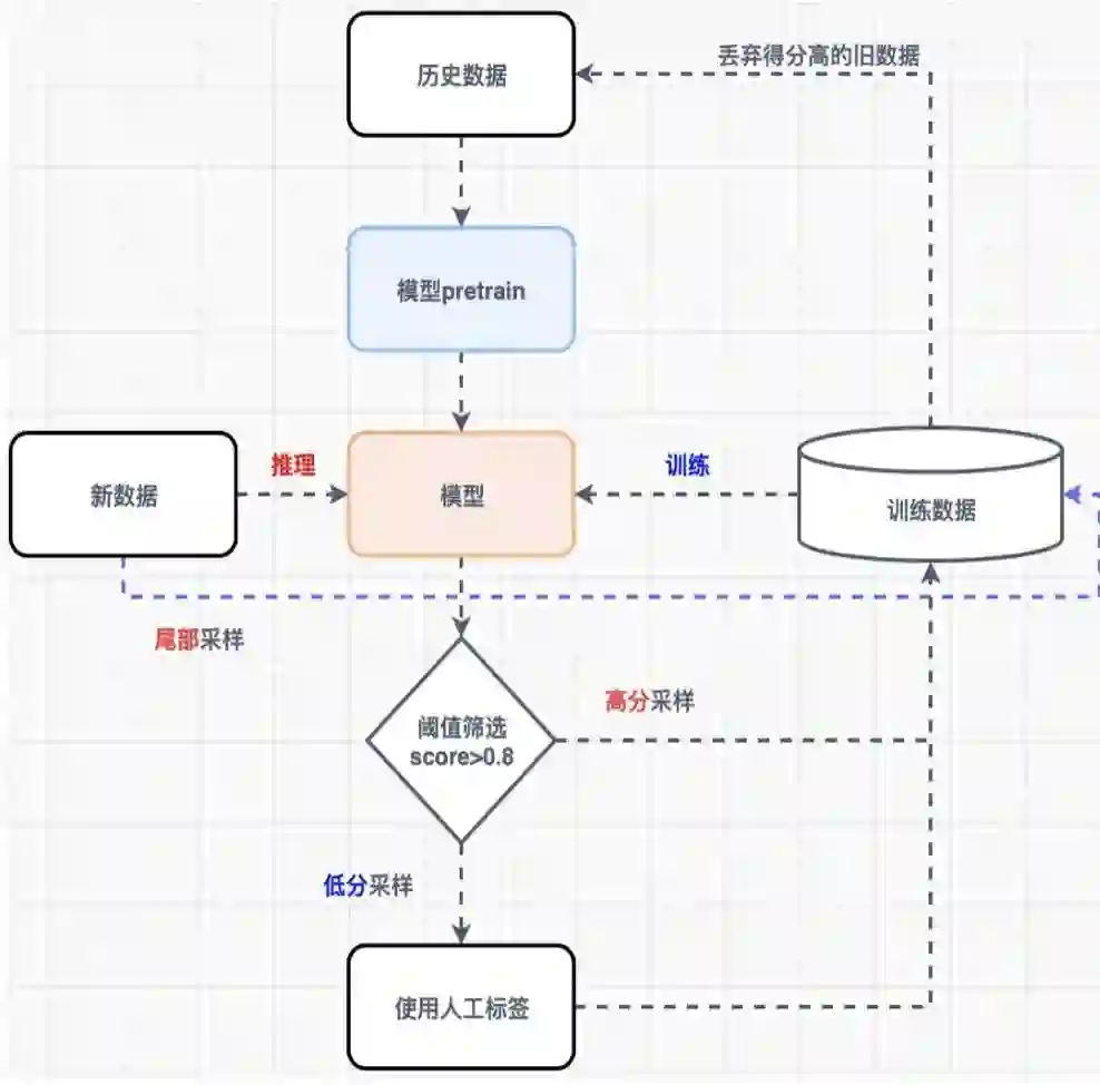 当然,真实场景下的业务数据是具备一定的时延性的,如果是长期维护的模型,一定是要不断进行数据迭代和清洗的,方法的话可以理解为主动学习