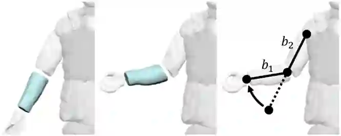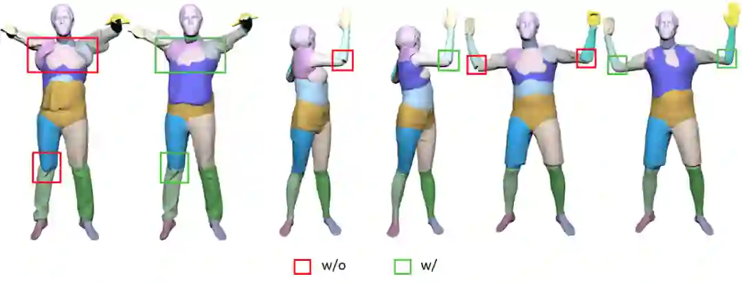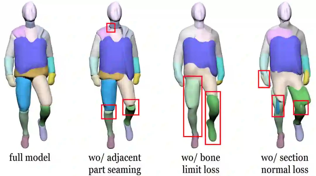 骨骼边界损失和截面法向损失:当两个部件在训练动作中几乎没有相对运动时,它们之间存在重叠的情况就无法避免。当我用新动作驱动模型时,就很容易出现暴露出原本重叠的部件,造成视觉瑕疵。作为正则项,我们提出一项骨骼边界损失旨在促使每个部件的表面穿过与它相连的关节,以及一项截面法向损失用于保证相接的部件的截面法向一致。这两项损失均是为了避免部件之间出现重叠或空缺。