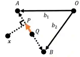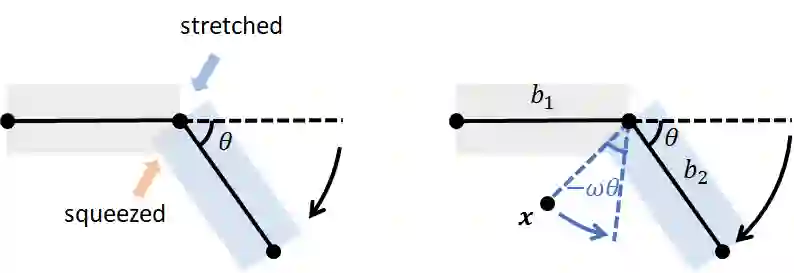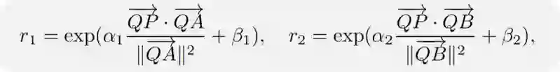 其中,Q 点将连接线 AB 按照 AO 和 BO 比例将划分为两部分。基于上式的定义,点 x 离骨骼越近,则刚度越大。α 和 β 是可优化的参数,用于建模各部件的刚度特性。