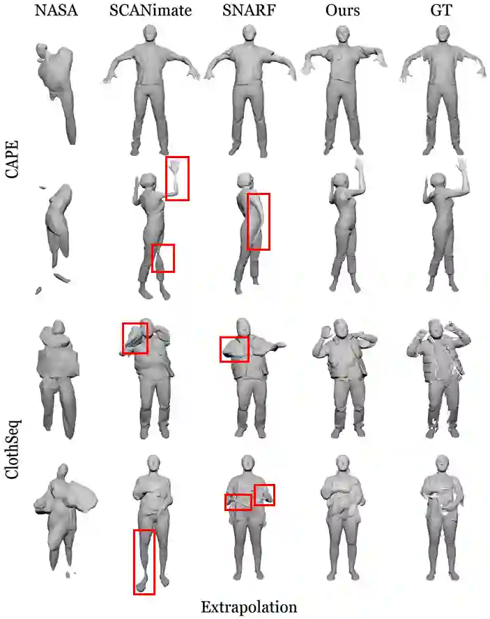 在人体形体的重建和驱动领域,近期方法普遍将网格模型替换成神经隐式函数作为形状表达,并沿用在网格模型中普遍运用的线性蒙皮算法(LBS)进行人体驱动。但这一做法忽视了将 LBS 应用在神经隐式函数上的种种问题,比如,需要另外学习一个蒙皮权重函数来定义连续空间中任意一点的蒙皮权重。而在逆向蒙皮过程中,蒙皮权重函数需要随着人体姿势的变化而改变,表现出十分有限的动作泛化能力。