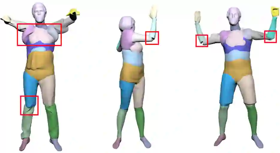 通过上述方法,该方法已经能够在训练动作下保证部件的正确划分和紧密相接。但在推广至新动作时,仍存在下图所示的断裂和重叠的问题。