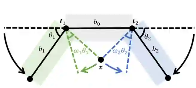 首先将空间中一点 x 随着骨骼运动的趋势定义为骨骼在该点的刚度 r,则上图中点 x 相对于骨骼和骨骼