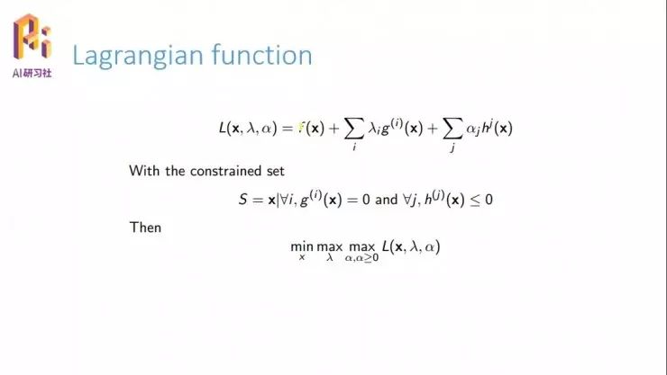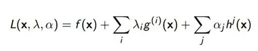 前面提到我们要构造拉格朗日函数。要构造拉格朗日函数也简单,我们现在有一个等式约束,还有一个不等式约束,只要在等式约束和不能约束之前加入一个系数,当然我们是把这些系数看作变量的。把这些系数加入到原来的函数之上,构成了一个新的函数系统,我们就可以把它叫做广义拉格朗日函数。