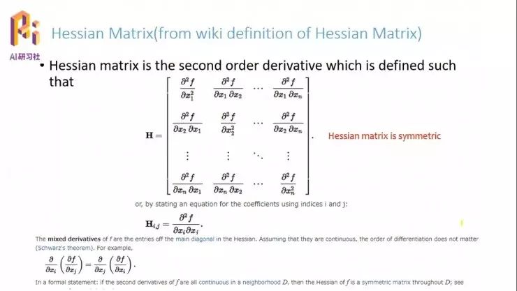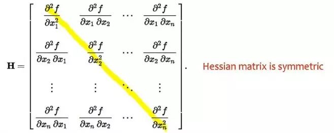 黑塞矩阵有一个特点,对于一个系统,如果它的偏导数不分方向的,就是说先对 xi 求导、或者先对 xj 求导,求导的先后顺序不影响二次导数值的话,那么黑塞矩阵就明显是一个对称矩阵,因为 xi、xj 可以互相交换。就是说对先对 x2 求导或者先对 x1 求导是没有关系的,那么∂x1*∂x2 和∂x2*∂x1 是相等的。