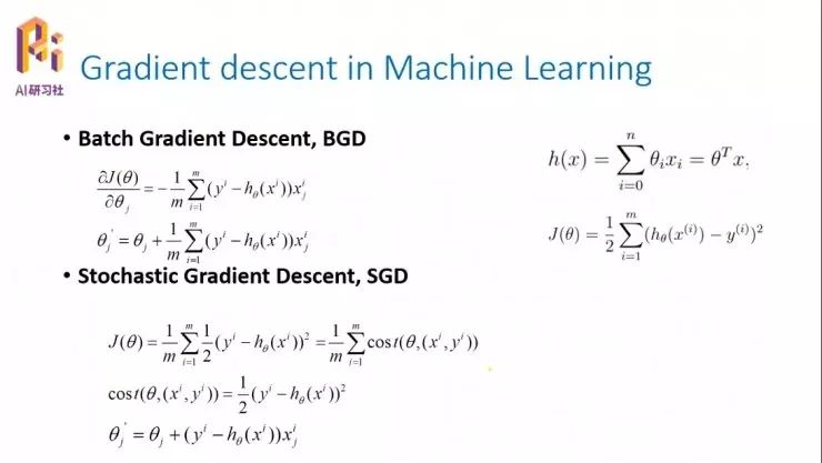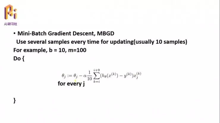 首先我们要求它的偏导数,∂J(θ)/∂θj,它表示一个方向,然后沿着这个方向更新那个变量。在变量更新的时候,批梯度下降是指每一次的变量更新,都会用到所有的 xj;然后从 i=1 到 m,会用到所有的单独变量的偏导数。比如假设这个系统里面的每一个样本有五个特征的话,那么在更新任意一个权值的时候都要把这五个特征遍历一遍。