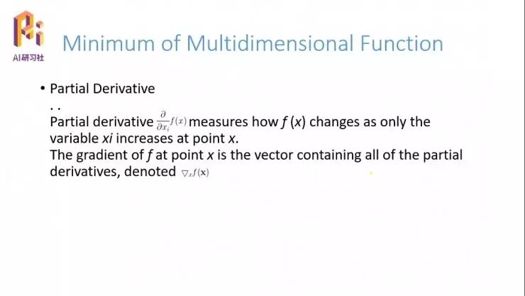 把所有的变量的偏导数求出来,并用向量的形式表示出来,可以表示成这个形式。刚才我们分析过了,如果要找到局部极值点的话,我们最快的方向是求导数、沿着梯度的方向;那么多变量系统里面也一样,就是说我们要求一个系统的最小值的话,还是通过求导,但这次是多变量的系统,所以我们的求导要改成偏导数向量的方向来去寻找新的最值。
