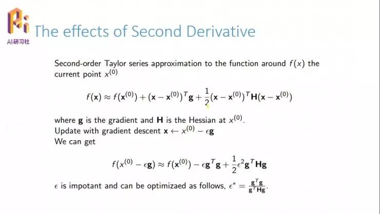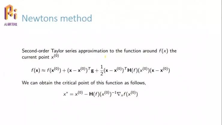 我们看一下牛顿迭代方法,这是刚才提到的泰勒展开,然后现在想要找到这个系统的极值点,当然,仅仅求导就行了。根据一阶导数为 0,它的临界点就是图中下方这个公式。这样我们更新就按照这个公式。