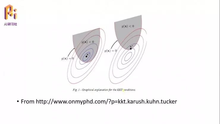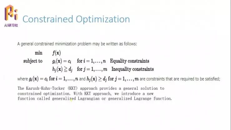 这里介绍一个 KKT 的约束优化算法。KKT 优化算法其实很简单,它就是构造了一个广义的拉格朗日函数,然后我们针对这个广义的拉格朗日函数,或者是这个系统来求它的极值。