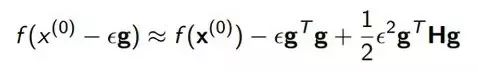 当我们更新 x 值的时候,比如说现在是 x0,然后下一步更新到 x0-εg 的时候(这是刚才梯度下降的定义嘛),带入这个泰勒展开会得到图中下方的公式。