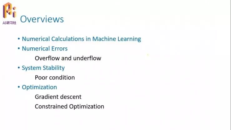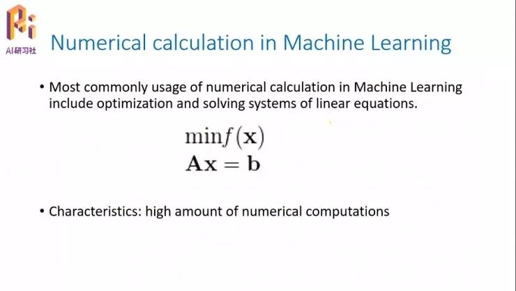 我们首先来看一下机器学习中的数值计算问题。所谓的机器学习或者深度学习,其实最终的目标大部分都是极值优化问题,或者是求解线性方程组的问题。这两个问题无论哪个,我们现在的求解办法基本上都是基于计算机的反复迭代更新来求解。因为目前肯定是没有解析解的,大家都是通过离散数学来求解这两个问题。