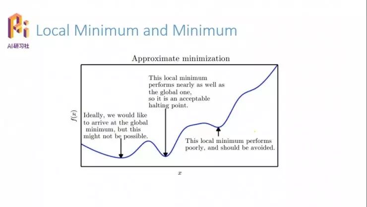 我们看一个复杂一点的。像这个函数曲线,图中有三个点都满足我们刚才说的一阶导数为零,但是右侧这两个点就不是我们想要的,最左侧点的值更小。这个时候就有两个问题,就是局部极值和全局最值的问题。这三个点都可以称为局部的极值点,只要满足一阶导数为零,但是怎么判断你所求的局部极值点是否是全局的最值点?有一个简单的办法是把整个系统所有的极值点都找到,然后比从里面比较出最小值;但是在实际应用中是不会这么做的,一是浪费太多的计算资源,二是因为起点的不同,找这个局部极值点也会有很多的问题。