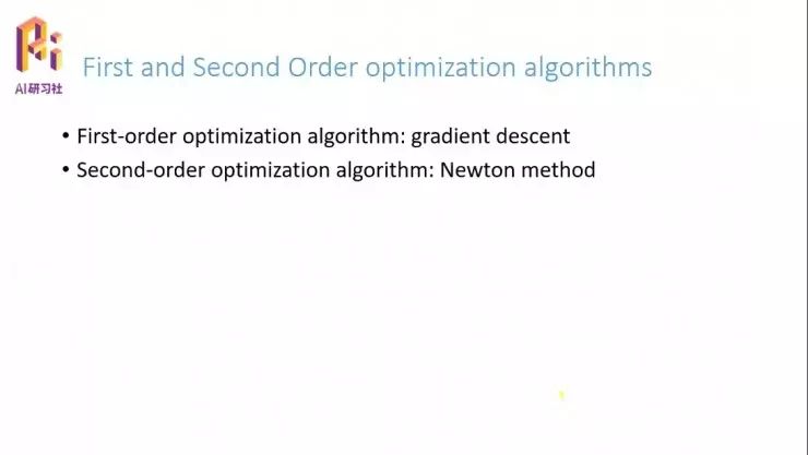下面我介绍两个方法,一个是仅仅用了一阶导数的、我们前面提到的 gradient descent;另一个是牛顿方法,这是用到二阶导数的方法。梯度下降仅仅用到了一阶导数,所以我们把它称为一阶优化算法;牛顿方法用到了二阶,我们就把牛顿方法称为二阶优化算法。