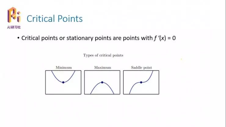 所谓的临界点是指,它的一次导数为零,也就是说这个点往左或者往右都会都会变大或变小,这个点本身就是这个小的局部系统里面的一个极值点。如果你往两边走都是变大,那么它就是一个极小值点;如果你往两边走都是变小,那么它就是一个极大值点;如果一边减小、一边变大,这种情况是我们在计算里面最不想看到的情况,叫做驻点,虽然它的导数也是零,但是这个点并不是我们所期待的那个 objective point,不是我们想要找的目标点。