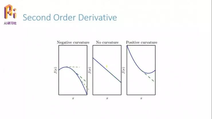 看一下这几个简单的例子。我们知道一阶导数的意义表示的是 f(x) 的变化,二阶导数的意义就是一阶导数的变化情况。比如说第一幅图,它的一阶导数从正(上升)到 0(水平)再到负的(下降),不停地减小,就可以知道它的二阶导数是小于 0 的。第二幅图一条直线的话,它的斜率也就是一阶导数是永远不变,那么它的二阶导数就永远是 0;同理第三个图指的是二阶导数大于零的情况。