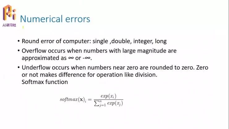 这两个问题,一个叫做分母趋近于 0,或者是分子趋近于无穷大,一个叫 underflow,下溢,就是指分母过于小;一个是 overflow,是指分子过于大,趋近于无穷。这两个问题都是由于计算机的数据有一个有限的范围而产生的,并不是我们的算法本身系统产生的。这是 Numerical error 其中的一种,我们可以把它理解为,数据类型的范围限定而导致的对于分子或者分母不能过大或过小而产生的限制。