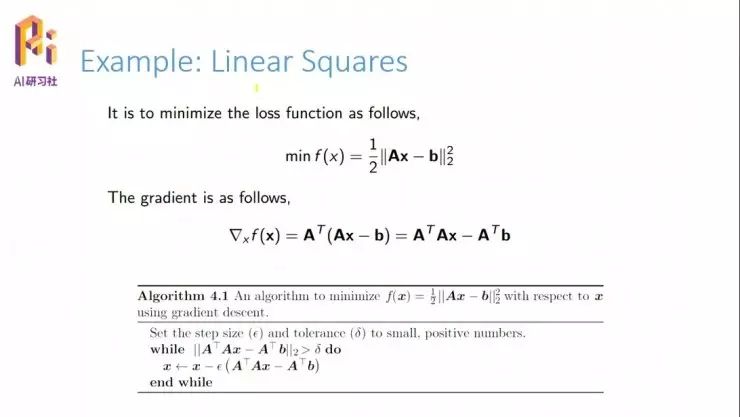 我们举一个简单的例子,最简单的,线性最小二乘法,这个是在求误差的时候最常用的损失函数或者目标函数了。那么我们可以用到前面讲到的梯度下降法,求它的导数,然后 x 更新的话就是用一个小的补偿系数乘以Δx,就是它的梯度。当然你也可以用牛顿方法,用求它的二阶导数来更新。