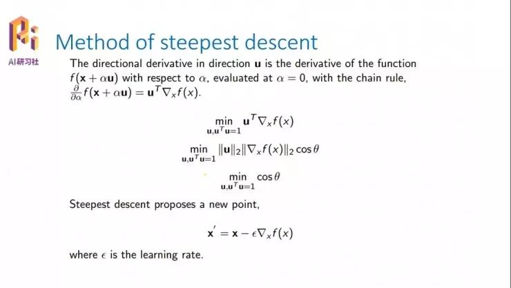 最优化问题,所谓的最优化去找最小值或者是最大值,涉及到两个问题,一是我怎么找、往哪个方向走;第二个问题是,我知道了这个方案以后我应该怎么走,每一步走多少。这基本上是所有求最值的两个问题,一个是找方向,第二个是找步长。