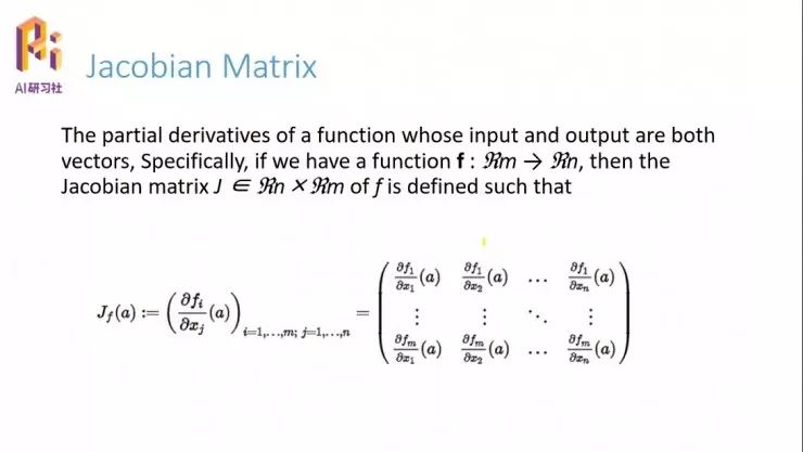 二阶导数的意义就是我们可以分析这个系统。下面先介绍一个雅克比矩阵(Jacobian Matrix),我们的系统是一个多输入、多输出的系统,它变量的范围是 Rm 域的范围,输出是 Rn 域的范围,那么 f(x) 的雅克比矩阵就是,针对所有的输入啊求导,比如第一行是那个 f1 对所有的输入变量求导,第二行就是 f2,f 的第二个变量,对所有的变量求导;同理,最后一行就是 fm 对所有的变量求导。这就是雅克比矩阵的定义。