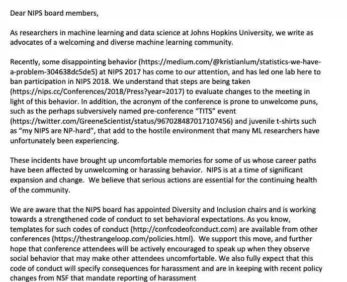 图|约翰霍普金斯大学的公开信,要求改名:应避免“NIPS”这个词产生“容易遭受性骚扰的恶劣环境”(图片来源:约翰霍普金斯大学)