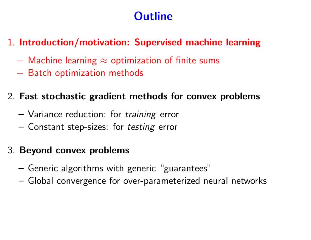 本报告概述了监督机器学习、面向凸优化的快速随机梯度方法、更多超越凸优化的问题。