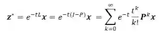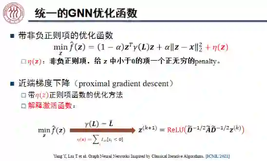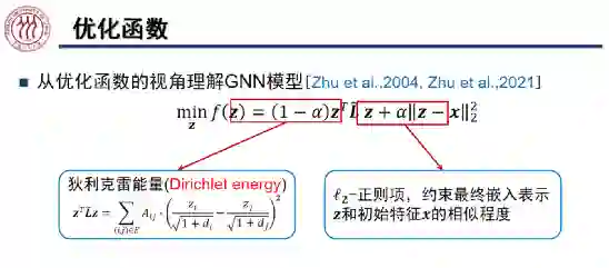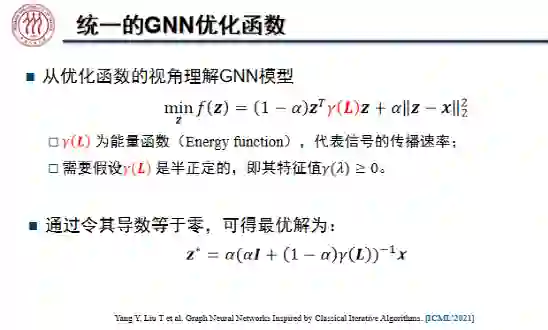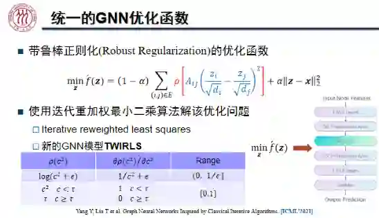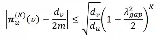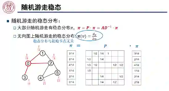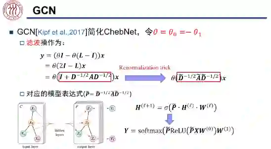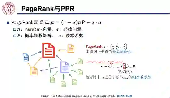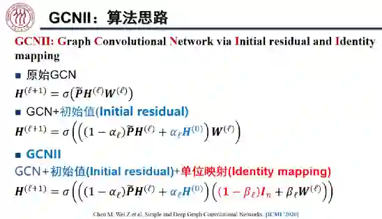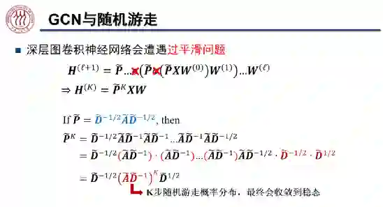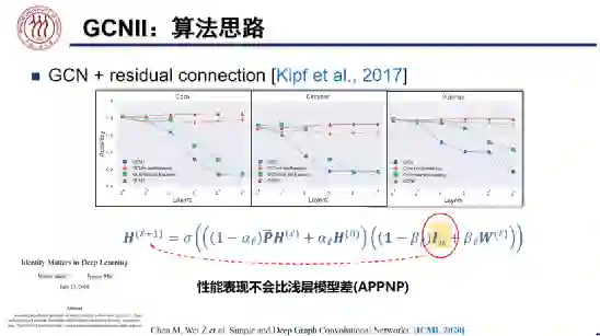 在随机游走的马尔科夫过程中,我们在每一步上从某节点以相等的概率走向该节点的某个相邻节点,概率转移矩阵记为。大部分随机游走过程会收敛到某个稳态上,即。在无向图上,节点 v 处的稳态为,即 v 点的度除以两倍的图中边总数。可见,稳态分布与随机游走的起始节点无关。我们可以通过 Cheeger 不等式刻画在随机游走中收敛的速度,该不等式也可以被用于社区发现: 其中为从节点 u 开始的第 K 步随机游走,为拉普拉斯矩阵最小的非零特征值。 我们可以通过随机游走解释 GCN 的过平滑现象。如上图所示,在去掉激活函数后,第 K 层的图表示结果为,将归一化后的邻接矩阵展开后,可得。其中为 K 步随机游走后的概率分布,随着 K 的增大会收敛到稳态。也就是说,最终的图表示只与图的结构相关,与随机游走初始节点无关。随着图卷积网络层数加深,网络会逐渐「忘记」初始特征,出现过平滑现象,导致节点分类效果较差。 一些研究者曾试图通过加入残差连接(自环)解决过平滑,但该操作并不能奏效,因为该情况下的随机游走是一个速率较慢的 Lazy 随机游走,但仍然会收敛到稳态。Oono 和 Suzuki 等人于 ICLR 2020 发表的论文指出,当加入激活函数时,图神经网络收敛到稳态的速度乘指数形式,其收敛速度由图的拓扑结构决定。 GCNII:Simple and Deep Graph Convolutional Networks(ICML, 2020) 如上图所示,为了解决 GCN 存在的过平滑问题,魏哲巍教授团队通过初始值残差连接在每一层的图表示上加上初始特征,并且向每一层的权重中加入了单位映射,从而更多地保留了上一层的表示。 通过加入初始值残差,我们实现了「带重启」的随机游走,随机游走在每一步上有的概率返回初始状态,有的概率随机走向当前节点的任一邻居,此时稳态的分布就与起始节点有关了。这种随机游走与 PageRank 算法使用的方法类似。 受到马腾宇博士论文「Identity Matters in Deep Learning」的启发,我们向待学习的权重矩阵加入了单位矩阵,有效提升了模型的泛化能力。