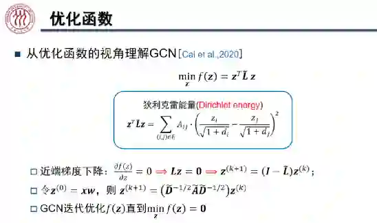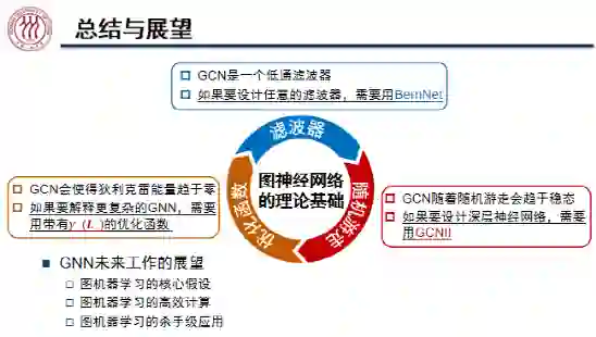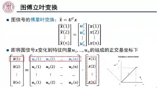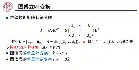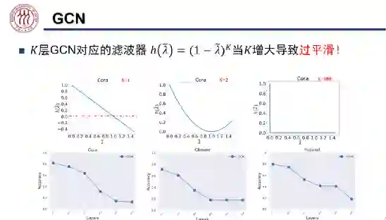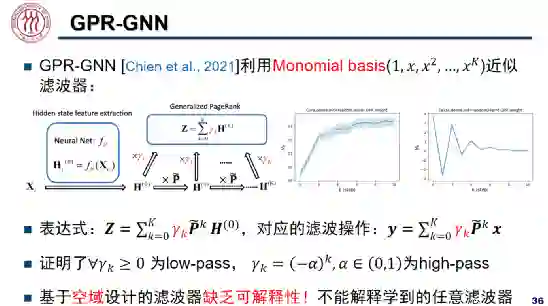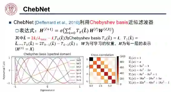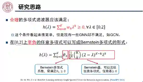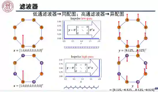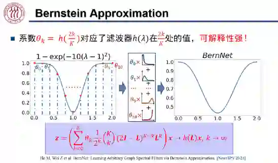 我们可以用向量表示图上的信号。如上图所示,我们将地图上不同的观测点作为图中的节点,节点上的红色线段的高度代表该观测点测量到的温度,这里测量到的温度可能不准确,带有一定的噪声。从图信号处理的角度出发,我们希望通过该观测点周围的信号对其进行平滑处理,使得该观测点的温度数据更加准确。具体而言,我们将图中节点的信号与拉普拉斯矩阵 L 的函数相乘,从而将节点的信号向邻居节点传播。 我们根据拉普拉斯矩阵的特征分解将图的傅里叶变换定义为如上图所示的形式。如前文所述,拉普拉斯矩阵 L 是一个对称矩阵,我们可以将其分解为三个矩阵的乘积。其中为对角矩阵,对角线上的值为特征值,特征值的取值范围为 [0,2]。和为正交矩阵,的每一个分量为拉普拉斯矩阵 L 的特征向量,其二范数为 1。由于 L 为对称矩阵,所以的任意两个特征向量正交,即点积为零。由于和为正交矩阵,则二者乘积为单位矩阵,因此图信号的傅里叶变换和傅里叶逆变换的关系成立。 如上图所示,图信号的傅里叶变换令图上的信号左乘,相当于对笛卡尔坐标系下的图信号旋转,将其变换到由中特征向量组成的正交基坐标下。 如上图所示,传统的时域-频域上的傅里叶变换是将时域中的函数分解为不同频率的波动函数的线性组合,此时我们可以将不同频率的信号看做一组正交基。就图傅里叶变换而言,我们可以将负无穷与正无穷相连的实数轴刻画为环状图,其特征向量的频率随着特征值的增加而增加,因此小的特征值对应低频特征向量,而大的特征值对应高频特征向量。可见,图傅里叶变换是将一组空域上的图信号转换为一组波动频率逐渐升高的正交基下的坐标的变换。 在对图信号进行滤波的过程中,我们首先对图信号进行傅里叶变换,接着我们对频谱域中的特征值做滤波操作,过滤掉某些频率的信息,进而将滤波后的信号通过图傅里叶逆变换转换到原始空间中。其中,/为滤波器,当都等于 1 时,该滤波器相当于一个全通滤波器。 卷积定理指出,卷积的傅里叶变换等于两个信号傅里叶变换的点积(Hadamard 积)。为谱域的卷积滤波器,它是 L 特征值的函数。如上图所示,图上的卷操作可以写作图傅里叶变换的形式。 在节点分类任务中,滤波器起到了决定性的作用。我们将边相连的节点通常属于同一类的图称为同配图,将边相连的节点通常属于不同类的图称为异配图。低通滤波器适用于同配图的分类,高通滤波器适用于对异配图的分类。 不幸的是,处于计算开销的考量,当节点数较多时,稠密矩阵的规模过大,特征值分解的复杂度太高。为此,目前主流的图卷积神经网络算法采用多项式近似滤波器,从而降低计算复杂度。 在 ChebNet 中,作者采用切比雪夫多项式近似滤波器,其表示能力强于 GCN。如上图所示,不同颜色的曲线代表了不同阶切比雪夫多项式对应的基,随着多项式阶数上升,其频率越来越高,这与图傅里叶变换类似。 ChebNet 在一些半监督任务上的效果欠佳。为此,Kipf 等人于 2017 年提出 GCN,简化了 ChebNet,只使用了前两阶的切比雪夫多项式,并且通过加入自环进行了重归一化。然而,该模型在进行节点分类时,只能使用两层 GCN,即利用 2 以内的邻居信息。 以低通滤波器为例,单层 GCN 低通滤波器可以线性地保留低频信号,过滤高频信号。但是,随着 GCN 层数 K 上升,滤波器会越来越平滑,在 K 极大的情况下几乎只允许最低频的信号通过。 此外,研究者们尝试使用各种各样的多项式学习滤波器。以 ICLR 2021 上发表的论文 GPR-GNN 为例,作者利用了 Monomial 学习多项式系数。大于等于零时,该网络相当于低通滤波器;时,该网络相当于高通滤波器。然而,该架构缺乏可解释性,不能解释学到的任意滤波器。 BernNet: Learning Arbitrary Graph Spectral Filters via Bernstein Approximation(NeurIPS, 2021) 在 NeurIPS 2021 上,魏哲巍教授团队提出了 BernNet,该架构可以学习/设计任意的谱滤波器。如前文所述,特征值,合理的多项式滤波器。若小于零,图神经网络的滤波结果会随着层数的奇偶变化震荡。然而,GCN 等图神经网络并不满足上述条件。 魏哲巍教授团队发现,在谱域上,区间内非负的任意多项式可以写成 Bernstein 多项式的形式,该多项式的系数,我们可以用一组 Bernstein 基线性近似任意多项式,从而学习任意的滤波器。受此启发,我们将 BernNet 模型定义为: Bernstein 多项式为 BernNet 带来了很强的可解释性,其中对应滤波器在处的函数值。如上图所示,假设滤波器函数为拒绝中频信号的,我们将[0,2]均匀分成 k 分,将「0」、「2」及每个分位数对应的定义为系数。我们将这组系数与对应的伯恩斯坦多项式线性组合起来就得到了右侧 BernNet 的曲线。为了保证,我们只需将重参数化为,从而保证该滤波器的值恒大于等于零。这样一来,我们就可以学习任意的滤波器,且拟合精度随着 k 的增加而提升。