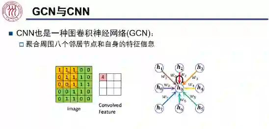Kipf 等人于 ICLR 2017 提出了 GCN,希望在图结构上聚合邻域信息,学习消息传递过程中的权重。如上图所示,在计算第 l+1 层表示的公式中,为第 l 层的表示结果,为每个节点带有自环的正则化之后的邻接矩阵,为待学习的权重矩阵,为非线性激活函数。上图中从上往下数最后三行为计算节点 0 表示的过程。 我们可以将卷积神经网络(CNN)看做一种特殊的图卷积神经网络(GCN)。当我们使用 3*3 的卷积核提取图像信息时,将中心节点周围的八个邻居节点及其自身的信息聚合起来,得到了新的表征。值得注意的是,在 CNN 中,每个节点与中心节点在信息聚合时的权值 w 是可以通过学习得到的,而 GCN 中节点之间的聚合权值仅由每个节点的度决定。 图神经网络已经被应用于节点分类、链接预测、社区发现等任务。例如在交通领域,DeepMind 利用图神经网络预测各个道路节点之间的交通流量,改进了 Google Map 的出行时间预测功能。在药物研发领域,研究者们将原子看做分子图中的节点,将化学键视为分子图中的边,利用图神经网络提取分子特征,预测分子的属性,从而筛选出制药所需要的合理分子结构。KDD Cup 2021 设立了大规模分子性质预测竞赛。 网址:Https://ogb.stanford.edu/kddcup2021