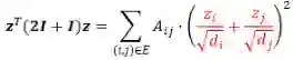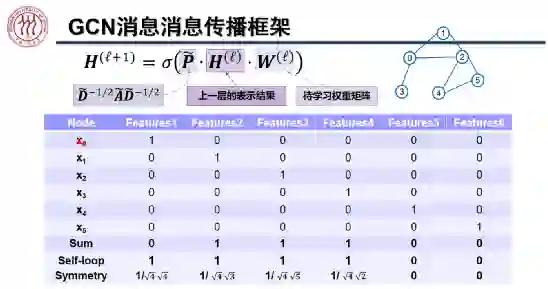 在现实生活中,图数据无处不在。例如,在社交网络中,可以将用户作为节点,好友关系、转发关系、点赞关系作为图中的边;在论文引用网络中,论文为节点,引用关系为边;在通讯信号网络中,信号基站、手机为节点,边的权重为节点之间的信号强度。 在无向图中,我们将节点集合定义为 V,其节点个数为 n;边集为 E,其节点个数为 m。若节点 i 和节点 j 之间存在连接关系(边),则邻接矩阵 A 中对应的元素值为 1,否则该元素的值为 0, A 为一个对称矩阵。ji矩阵 D 为一个对角矩阵,第 i 行对角线上的元素为节点 i 的邻居节点的数量。归一化后的邻接矩阵 P 为邻接矩阵 A 分别左乘、右乘,其中对角矩阵对角线上的元素为度矩阵 D 对角线上每个对应元素开根号、取倒数后的结果。归一化后的拉普拉斯矩阵为单位矩阵 I 与归一化后的邻接矩阵 P 之差。 除了刻画图结构信息的矩阵之外,我们将刻画每个节点特征信息的矩阵记为,其中 n 为节点个数,f 为特征维度。例如,上图中六个节点的特征分别为一个维数为六的 one-hot 向量。
