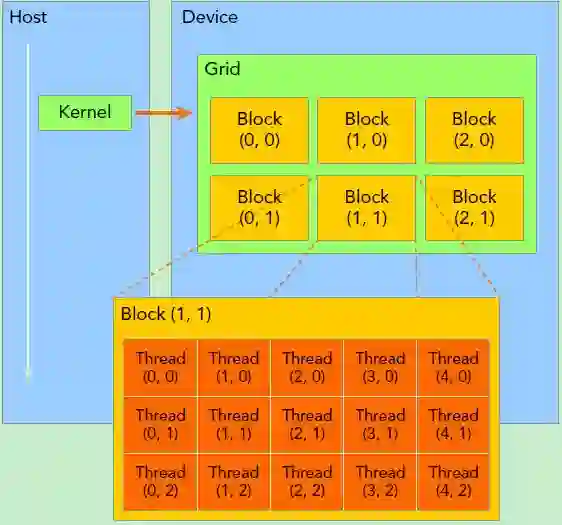 所以,一个线程需要两个内置的坐标变量(blockIdx,threadIdx)来唯一标识,它们都是dim3类型变量,其中blockIdx指明线程所在grid中的位置,而threaIdx指明线程所在block中的位置,如图中的Thread (1,1)满足: