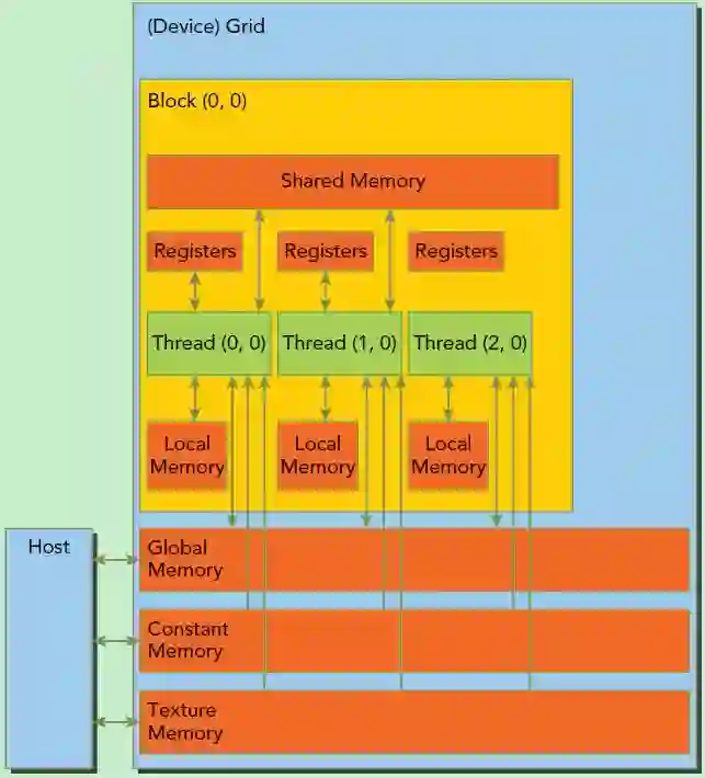 此外这里简单介绍一下CUDA的内存模型,如下图所示。可以看到,每个线程有自己的私有本地内存(Local Memory),而每个线程块有包含共享内存(Shared Memory),可以被线程块中所有线程共享,其生命周期与线程块一致。此外,所有的线程都可以访问全局内存(Global Memory)。还可以访问一些只读内存块:常量内存(Constant Memory)和纹理内存(Texture Memory)。内存结构涉及到程序优化,这里不深入探讨它们。
