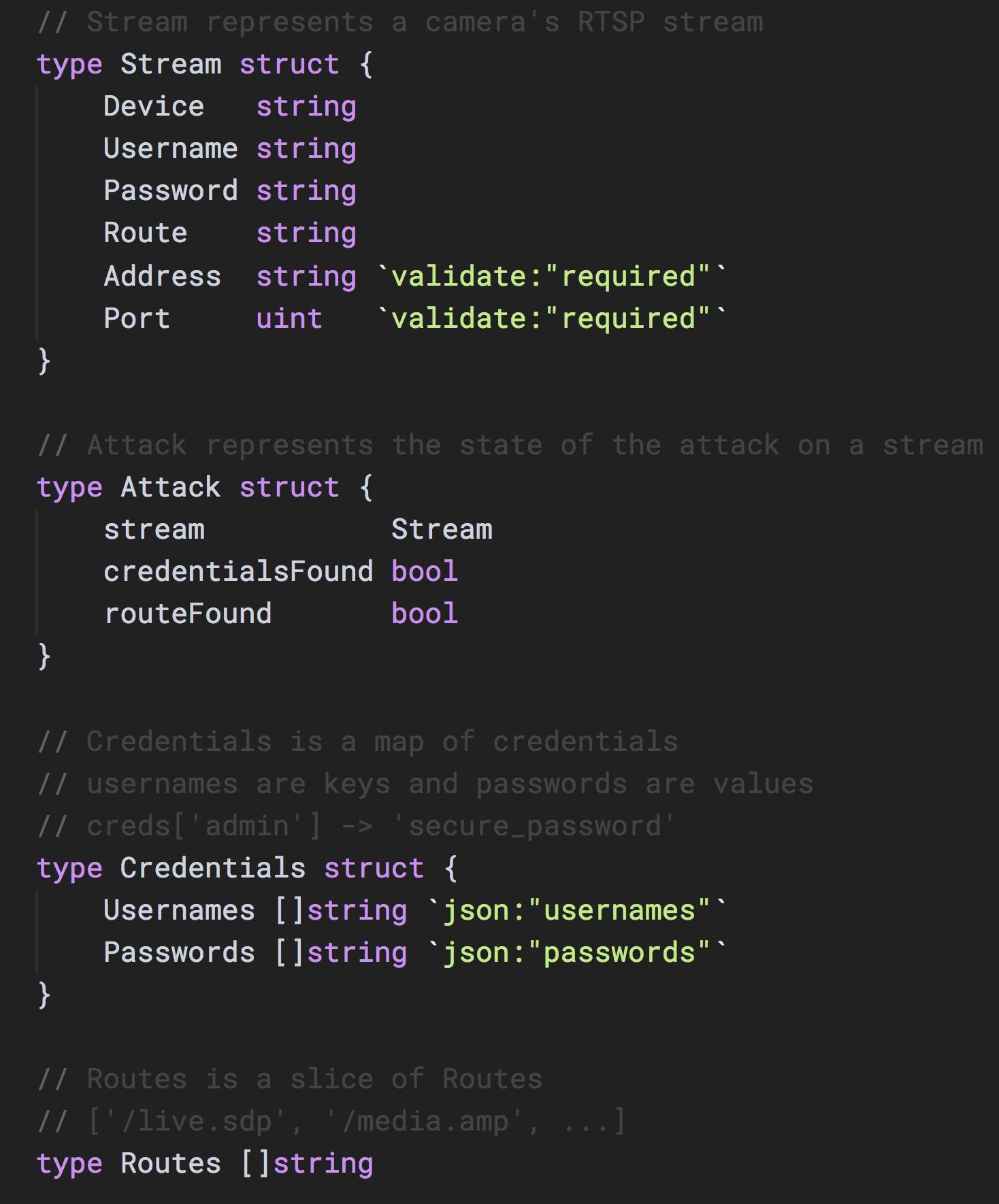 Cameradar为不同的功能设计了不同的数据模型结构: