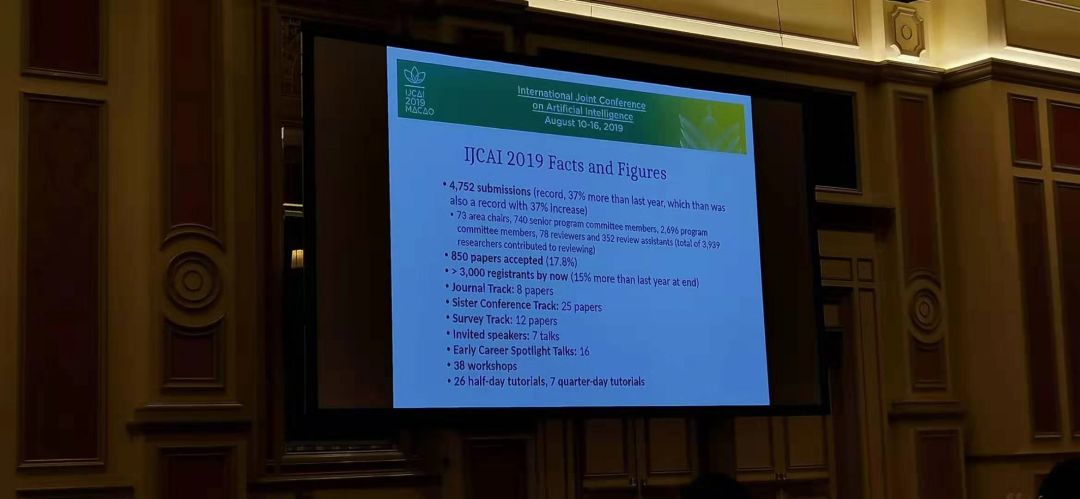 IJCAI 2019 大会今年在中国澳门举行。本届大会收到了将近 5000 篇投稿,有 850 篇被接收。其中,中国通讯作者的论文接收数最高。同时,大会公布了杰出论文,并向多位研究者颁发了卓越研究奖,而 CMU 德扑团队获得了第二个由 IJCAI 颁发的明斯基奖章。