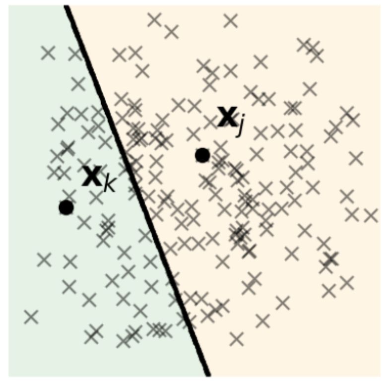 图 1:三元组分类器的样例。给定参考点 x_j 和 x_k,空间可被分成两个部分——分别靠近 x_j 和 x_k 的样本。而三元组信息足以说明 x_i 属于哪个空间。