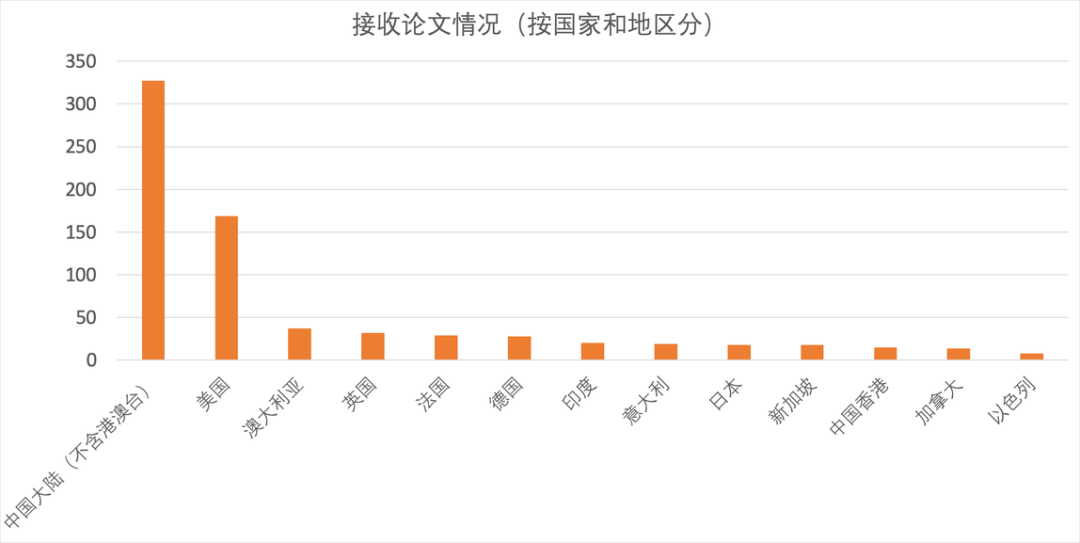 从接收的地区来看,中国大陆(不含港澳台)被接受论文的数量最多(按通讯作者统计)。