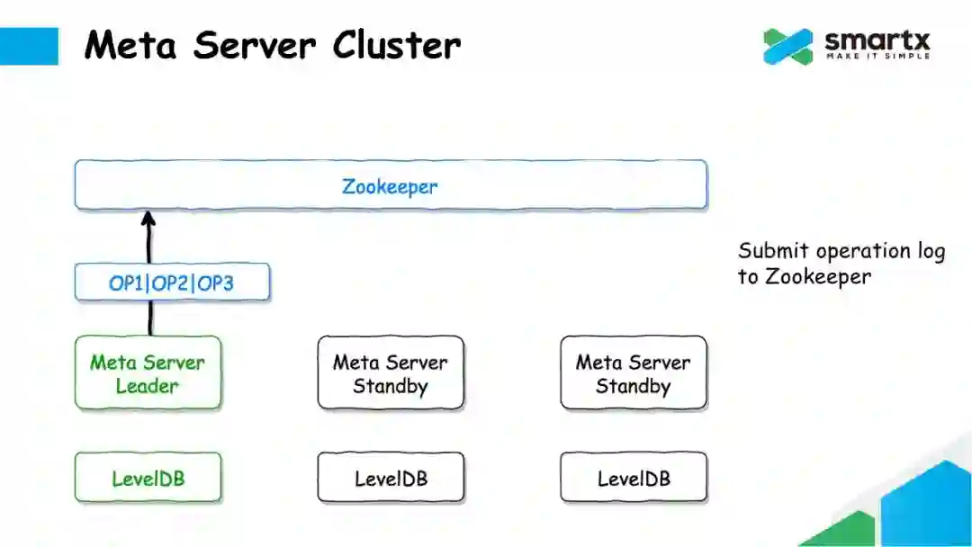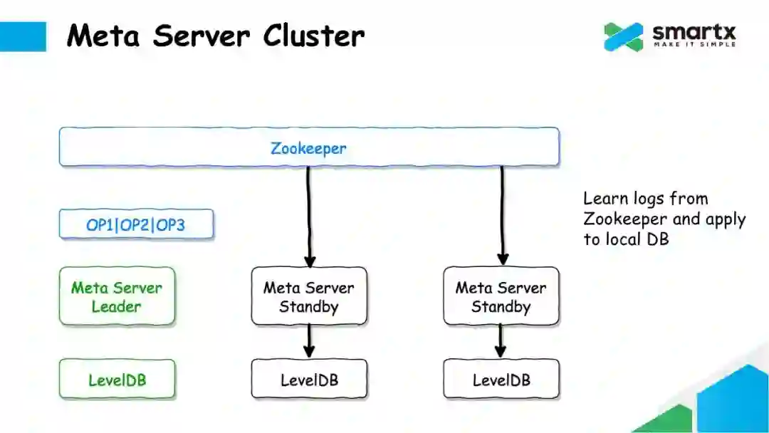 对于非 Leader 的 Meta Server 节点,会异步的从 Zookeeper 中拉取 Log,并将通过反序列化,将 Log 转换成对元数据的操作,再将这些修改操作提交到本地的 LevelDB 中。这样就能保证每一个 Meta Server 都可以保存一个完整的元数据。