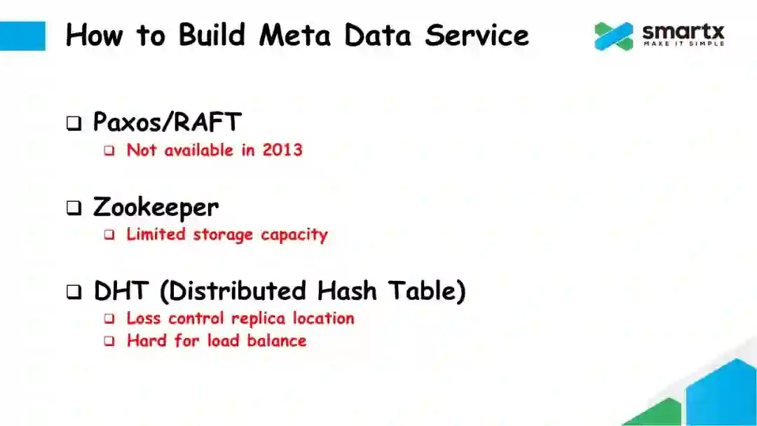 第四种是选择 Zookeeper。Zookeeper 基于 ZAB 协议,可以提供一个稳定可靠地分布式存储服务。但 Zookeeper 的最大的问题是能够存储的数据容量非常有限。为了提高访问速度,Zookeeper 把存储的所有数据都缓存在内存中,所以这种方案导致元数据服务所能支撑的数据规模严重受限于服务器的内存容量,使得元数据服务无法做到轻量级,也无法和数据服务混合部署在一起。